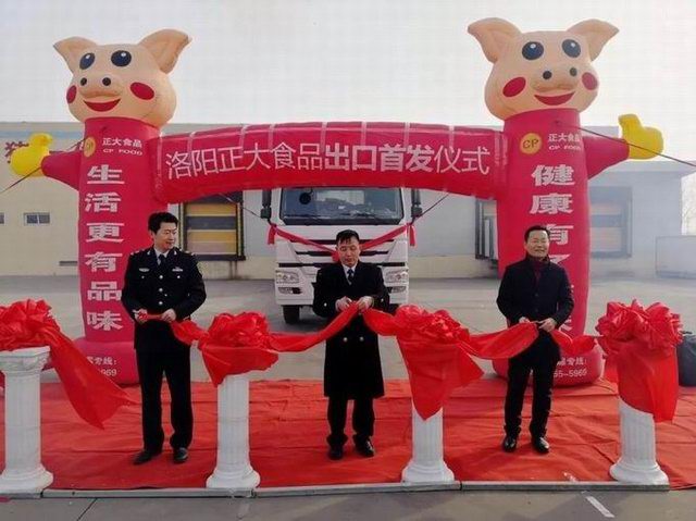 河南出入境檢驗檢疫局認證處副處長郭啟祥、洛陽出入境檢驗檢疫局局長郭學良、洛陽正大食品有限公司總裁王學斌共同為洛陽正大食品***出口發(fā)車剪彩放行。